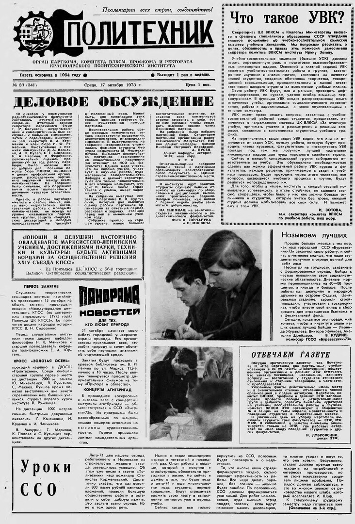 Политехник : газета/ Краснояр. политех. ин-т. - Красноярск : КГТУ, 1964 - - 2006 1973г. N 33 (341) (17 октября) http://lib3.sfu-kras.ru/ft/LIB2/ELIB_DC/SFUPRSV/sfupol/1973/1973_10_17_0341.pdf