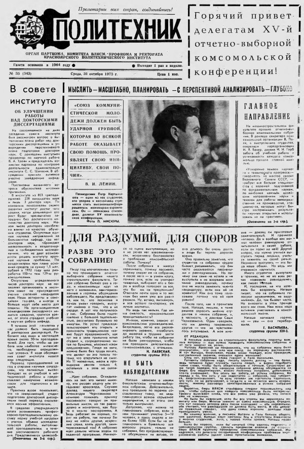 Политехник : газета/ Краснояр. политех. ин-т. - Красноярск : КГТУ, 1964 - - 2006 1973г. N 35 (343) (31 октября) http://lib3.sfu-kras.ru/ft/LIB2/ELIB_DC/SFUPRSV/sfupol/1973/1973_10_31_0343.pdf