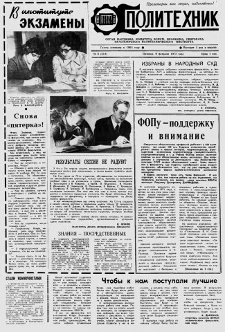 Политехник : газета. 1973 г. № 6 (314) (9 февраля)