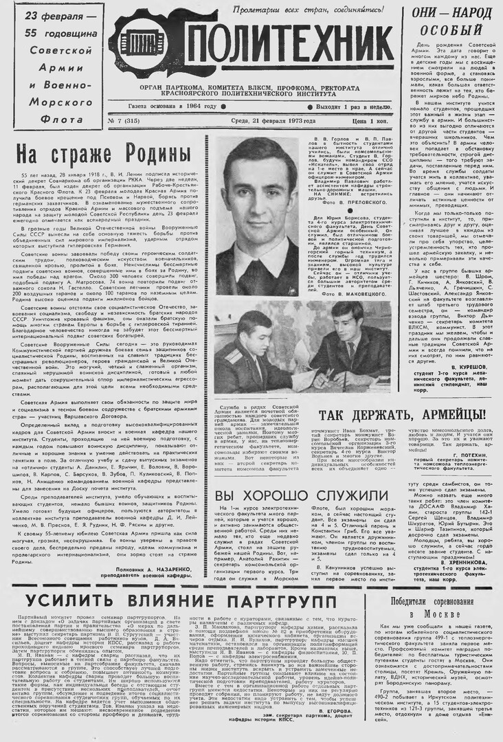 Политехник : газета/ Краснояр. политех. ин-т. - Красноярск : КГТУ, 1964 - - 2006 1973г. N 7 (315) (21 февраля) http://lib3.sfu-kras.ru/ft/LIB2/ELIB_DC/SFUPRSV/sfupol/1973/1973_02_21_0315.pdf