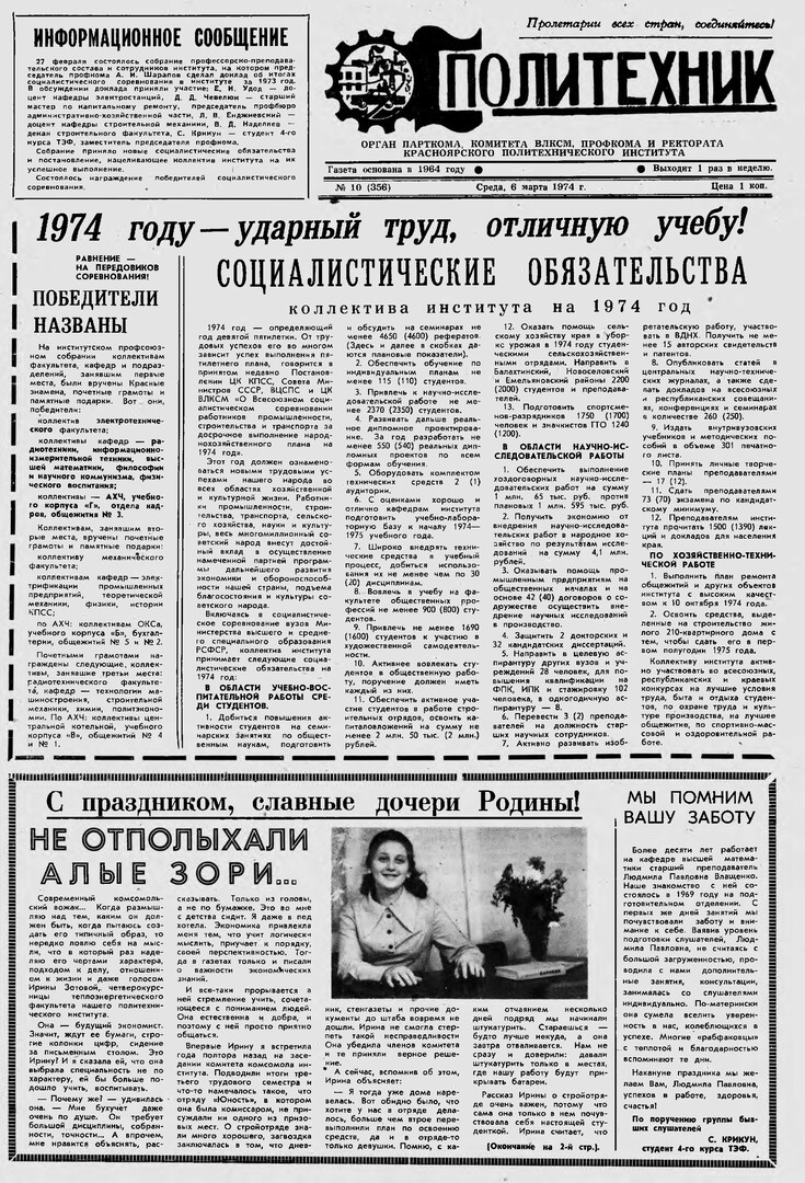 Политехник : газета/ Краснояр. политех. ин-т. - Красноярск : КГТУ, 1964 - - 2006 1974г. N 10 (356) (6 марта) http://lib3.sfu-kras.ru/ft/LIB2/ELIB_DC/SFUPRSV/sfupol/1974/1974_03_06_0356.pdf