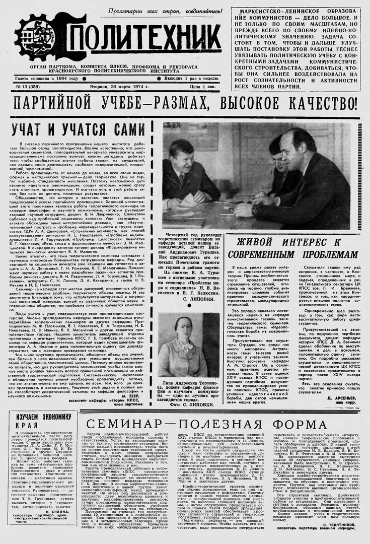 Политехник : газета/ Краснояр. политех. ин-т. - Красноярск : КГТУ, 1964 - - 2006 1974г. N 13 (359) (26 марта) http://lib3.sfu-kras.ru/ft/LIB2/ELIB_DC/SFUPRSV/sfupol/1974/1974_03_26_0359.pdf