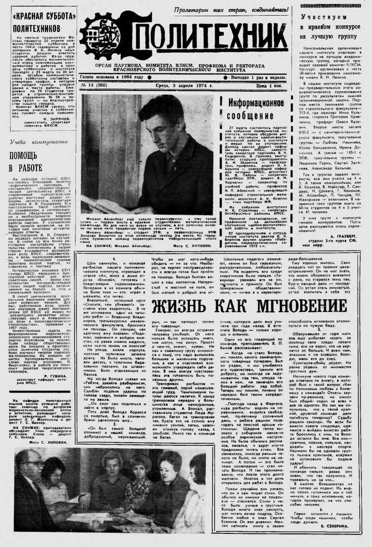 Политехник : газета/ Краснояр. политех. ин-т. - Красноярск : КГТУ, 1964 - - 2006 1974г. N 14 (360) (3 апреля) http://lib3.sfu-kras.ru/ft/LIB2/ELIB_DC/SFUPRSV/sfupol/1974/1974_04_03_0360.pdf