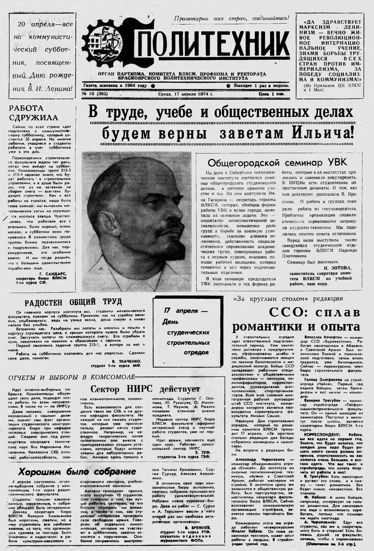 Политехник : газета/ Краснояр. политех. ин-т. - Красноярск : КГТУ, 1964 - - 2006 1974г. N 16 (362) (17 апреля) http://lib3.sfu-kras.ru/ft/LIB2/ELIB_DC/SFUPRSV/sfupol/1974/1974_04_17_0362.pdf