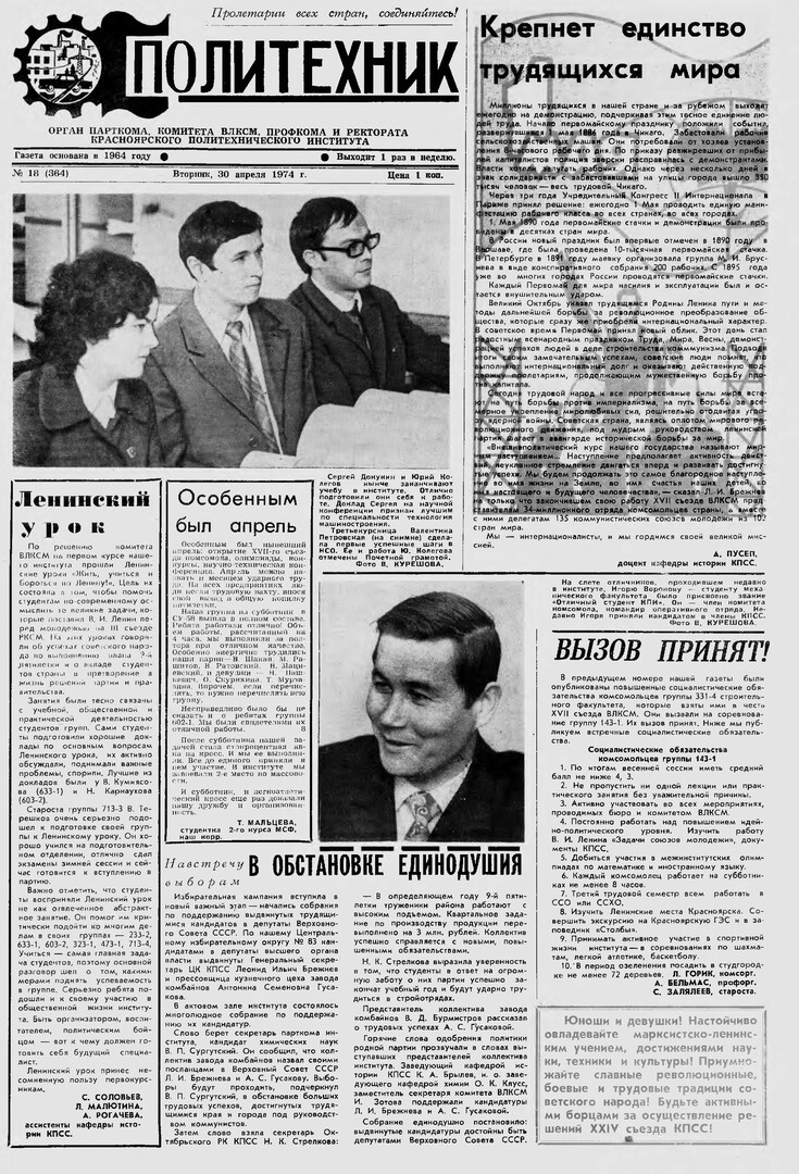 Политехник : газета/ Краснояр. политех. ин-т. - Красноярск : КГТУ, 1964 - - 2006 1974г. N 18 (364) (30 апреля) http://lib3.sfu-kras.ru/ft/LIB2/ELIB_DC/SFUPRSV/sfupol/1974/1974_04_30_0364.pdf