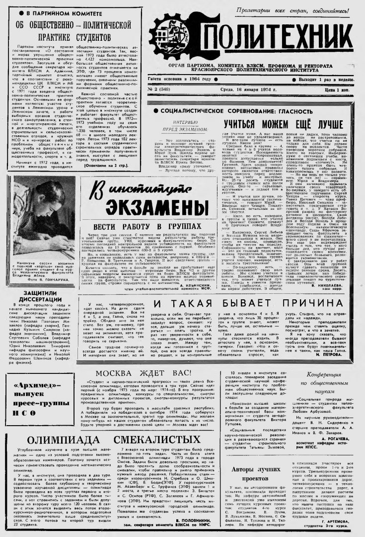 Политехник : газета/ Краснояр. политех. ин-т. - Красноярск : КГТУ, 1964 - - 2006 1974г. N 2 (348) (16 января) http://lib3.sfu-kras.ru/ft/LIB2/ELIB_DC/SFUPRSV/sfupol/1974/1974_01_16_0348.pdf