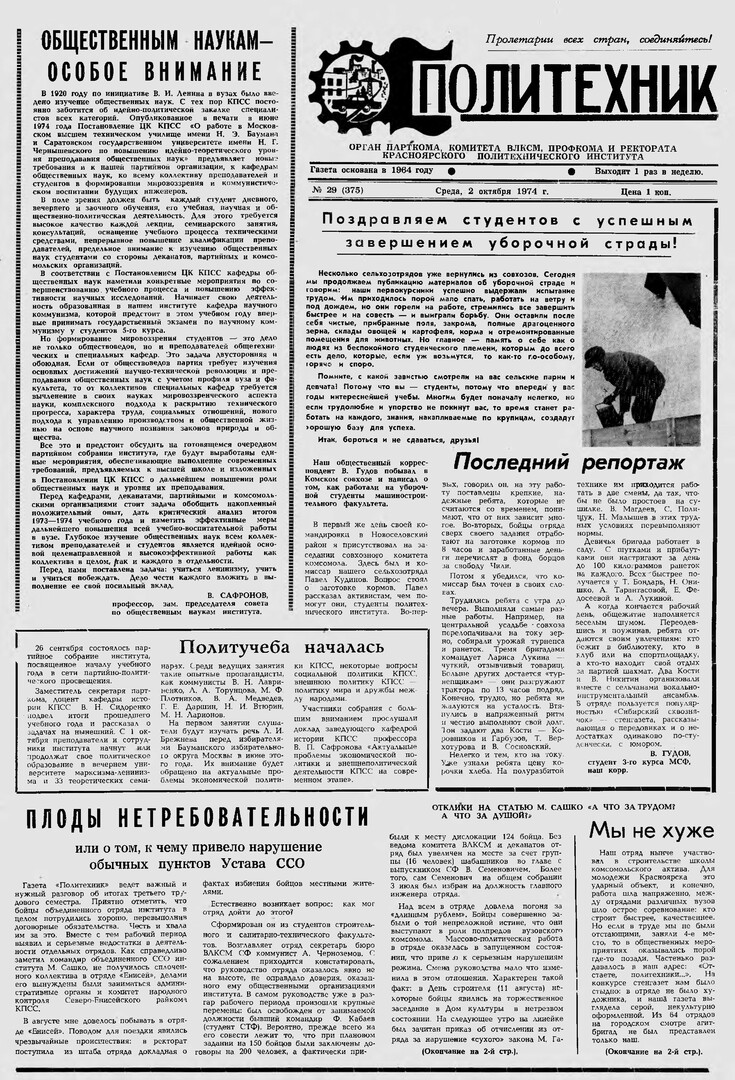 Политехник : газета. 1974 г. № 29 (375) (2 октября)