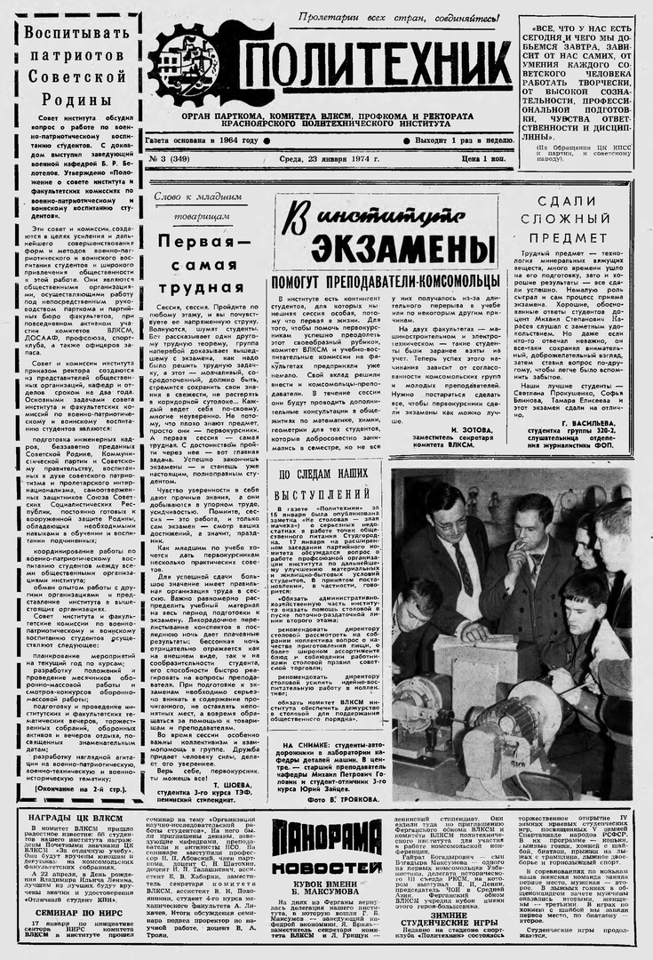 Политехник : газета/ Краснояр. политех. ин-т. - Красноярск : КГТУ, 1964 - - 2006 1974г. N 3 (349) (23 января) http://lib3.sfu-kras.ru/ft/LIB2/ELIB_DC/SFUPRSV/sfupol/1974/1974_01_23_0349.pdf