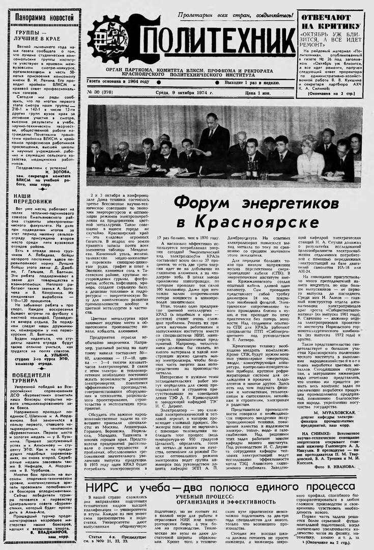 Политехник : газета/ Краснояр. политех. ин-т. - Красноярск : КГТУ, 1964 - - 2006 1974г. N 30 (376) (9 октября) http://lib3.sfu-kras.ru/ft/LIB2/ELIB_DC/SFUPRSV/sfupol/1974/1974_10_09_0376.pdf