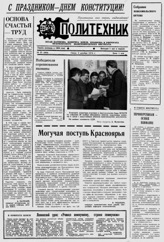 Политехник : газета/ Краснояр. политех. ин-т. - Красноярск : КГТУ, 1964 - - 2006 1974г. N 37 (383) (4 декабря) http://lib3.sfu-kras.ru/ft/LIB2/ELIB_DC/SFUPRSV/sfupol/1974/1974_12_04_0383.pdf