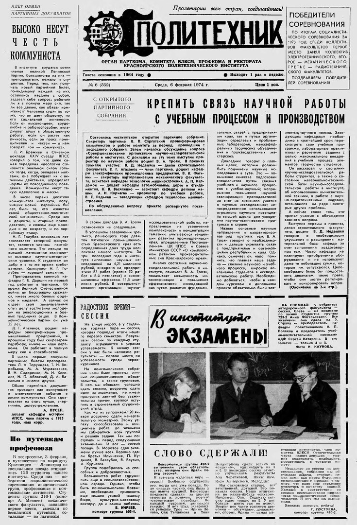 Политехник : газета/ Краснояр. политех. ин-т. - Красноярск : КГТУ, 1964 - - 2006 1974г. N 6 (352) (6 февраля) http://lib3.sfu-kras.ru/ft/LIB2/ELIB_DC/SFUPRSV/sfupol/1974/1974_02_06_0352.pdf