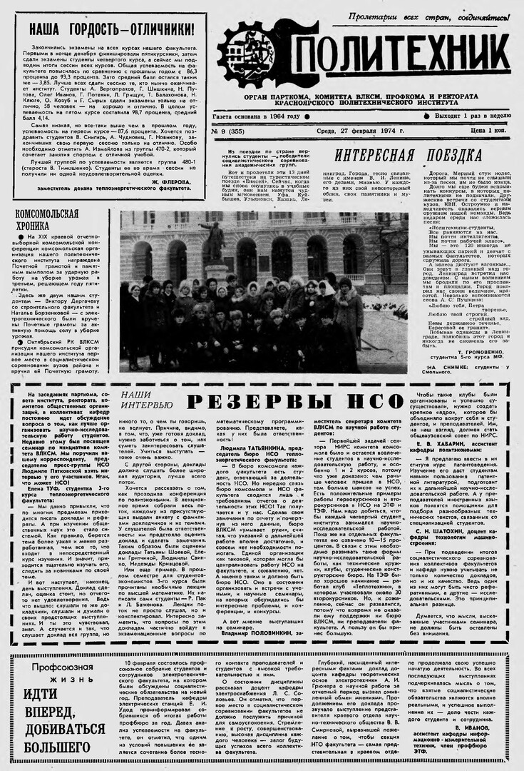 Политехник : газета/ Краснояр. политех. ин-т. - Красноярск : КГТУ, 1964 - - 2006 1974г. N 9 (355) (27 февраля) http://lib3.sfu-kras.ru/ft/LIB2/ELIB_DC/SFUPRSV/sfupol/1974/1974_02_27_0355.pdf