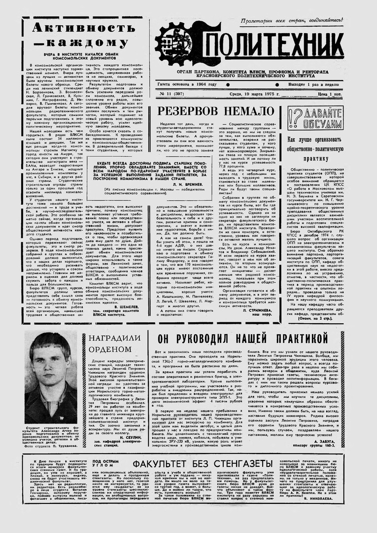 Политехник : газета/ Краснояр. политех. ин-т. - Красноярск : КГТУ, 1964 - - 2006 1975г. N 11 (397) (19 марта) http://lib3.sfu-kras.ru/ft/LIB2/ELIB_DC/SFUPRSV/sfupol/1975/1975_03_19_0397.pdf