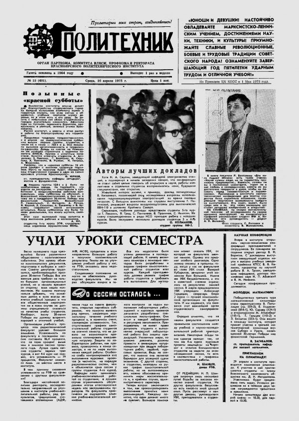 Политехник : газета/ Краснояр. политех. ин-т. - Красноярск : КГТУ, 1964 - - 2006 1975г. N 15 (401) (16 апреля) http://lib3.sfu-kras.ru/ft/LIB2/ELIB_DC/SFUPRSV/sfupol/1975/1975_04_16_0401.pdf