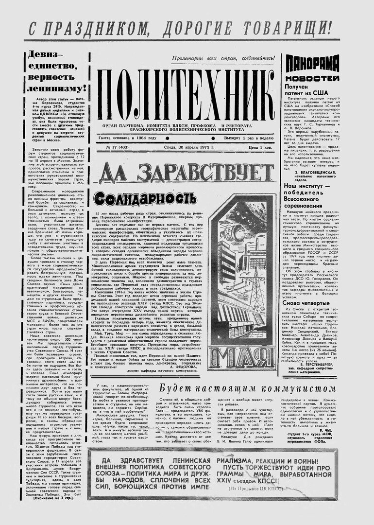 Политехник : газета/ Краснояр. политех. ин-т. - Красноярск : КГТУ, 1964 - - 2006 1975г. N 17 (403) (30 апреля) http://lib3.sfu-kras.ru/ft/LIB2/ELIB_DC/SFUPRSV/sfupol/1975/1975_04_30_0403.pdf