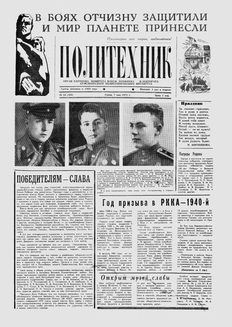 Политехник : газета/ Краснояр. политех. ин-т. - Красноярск : КГТУ, 1964 - - 2006 1975г. N 18 (404) (7 мая) http://lib3.sfu-kras.ru/ft/LIB2/ELIB_DC/SFUPRSV/sfupol/1975/1975_05_07_0404.pdf