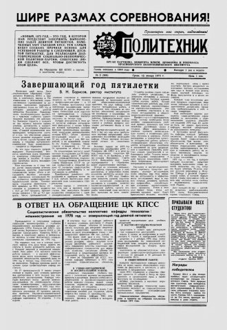 Политехник : газета/ Краснояр. политех. ин-т. - Красноярск : КГТУ, 1964 - - 2006 1975г. N 2 (388) (15 января) http://lib3.sfu-kras.ru/ft/LIB2/ELIB_DC/SFUPRSV/sfupol/1975/1975_01_15_0388.pdf