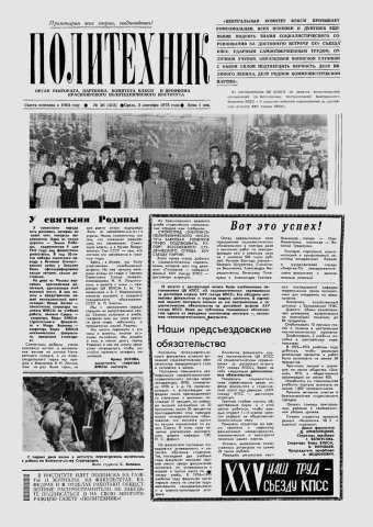 Политехник : газета/ Краснояр. политех. ин-т. - Красноярск : КГТУ, 1964 - - 2006 1975г. N 26 (412) (3 сентября) http://lib3.sfu-kras.ru/ft/LIB2/ELIB_DC/SFUPRSV/sfupol/1975/1975_09_03_0412.pdf