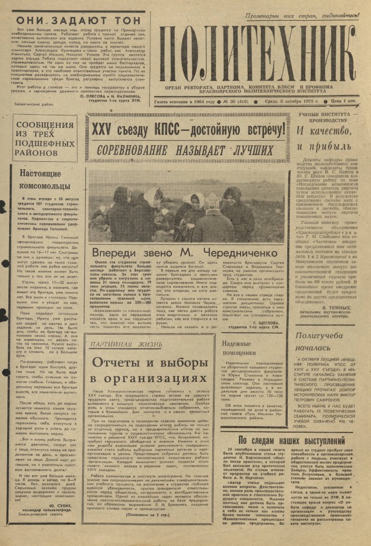 Политехник : газета/ Краснояр. политех. ин-т. - Красноярск : КГТУ, 1964 - - 2006 1975г. N 30 (416) (8 октября) http://lib3.sfu-kras.ru/ft/LIB2/ELIB_DC/SFUPRSV/sfupol/1975/1975_10_08_0416.pdf