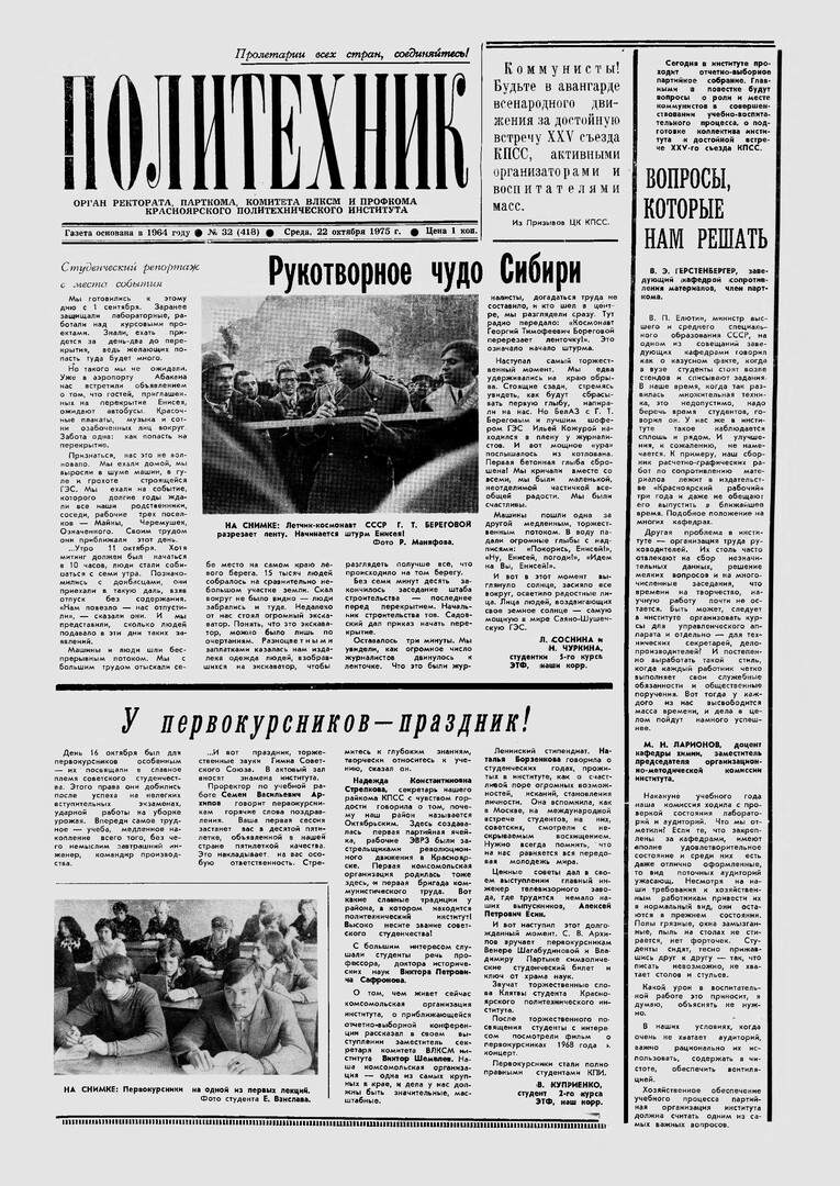 Политехник : газета/ Краснояр. политех. ин-т. - Красноярск : КГТУ, 1964 - - 2006 1975г. N 32 (418) (22 октября) http://lib3.sfu-kras.ru/ft/LIB2/ELIB_DC/SFUPRSV/sfupol/1975/1975_10_22_0418.pdf