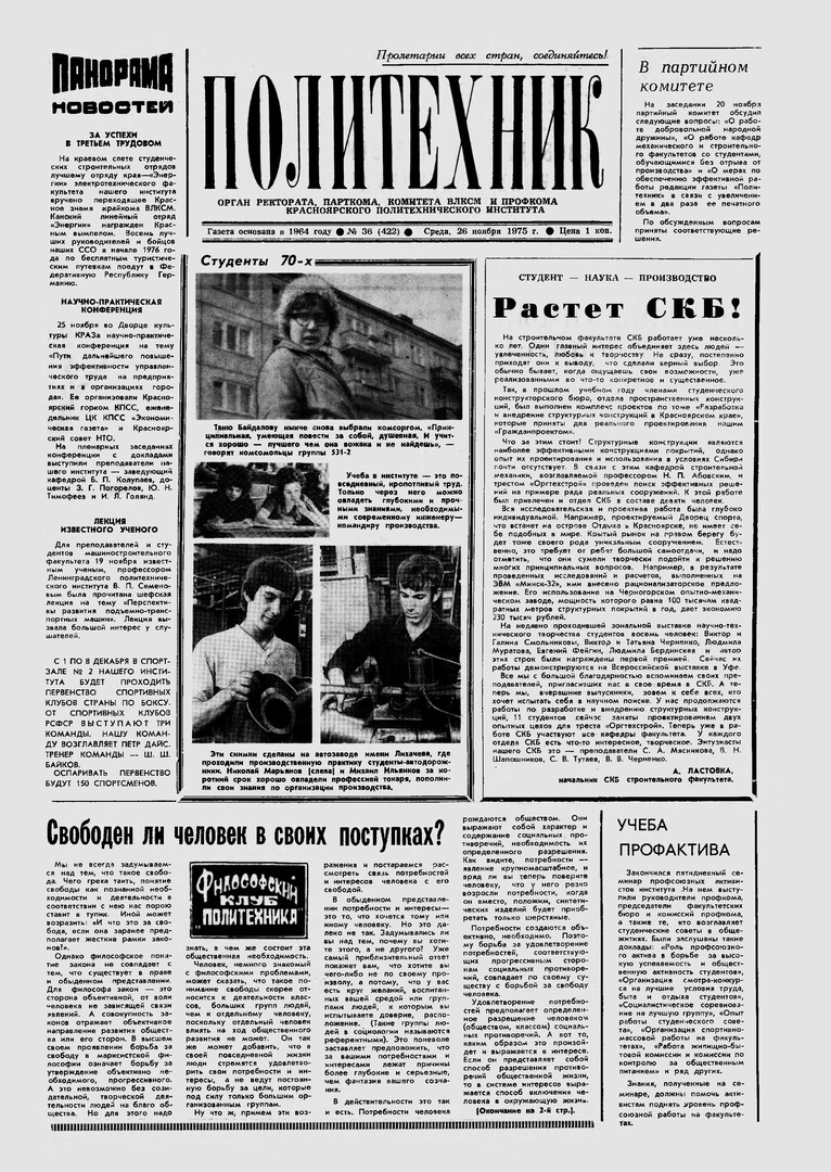 Политехник : газета/ Краснояр. политех. ин-т. - Красноярск : КГТУ, 1964 - - 2006 1975г. N 36 (422) (26 ноября) http://lib3.sfu-kras.ru/ft/LIB2/ELIB_DC/SFUPRSV/sfupol/1975/1975_11_26_0422.pdf