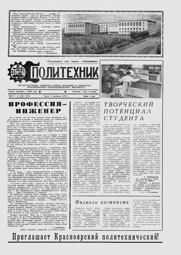 Политехник : газета/ Краснояр. политех. ин-т. - Красноярск : КГТУ, 1964 - - 2006 1975г. N 5/6 (391-392) (5 февраля) http://lib3.sfu-kras.ru/ft/LIB2/ELIB_DC/SFUPRSV/sfupol/1975/1975_02_05_0391-0392.pdf