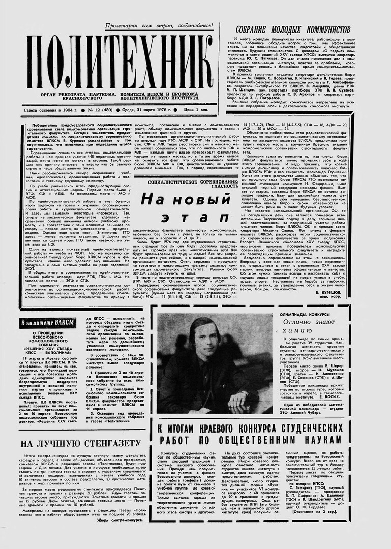 Политехник : газета/ Краснояр. политех. ин-т. - Красноярск : КГТУ, 1964 - - 2006 1976г. N 12 (439) (31 марта) http://lib3.sfu-kras.ru/ft/LIB2/ELIB_DC/SFUPRSV/sfupol/1976/1976_03_31_0439.pdf