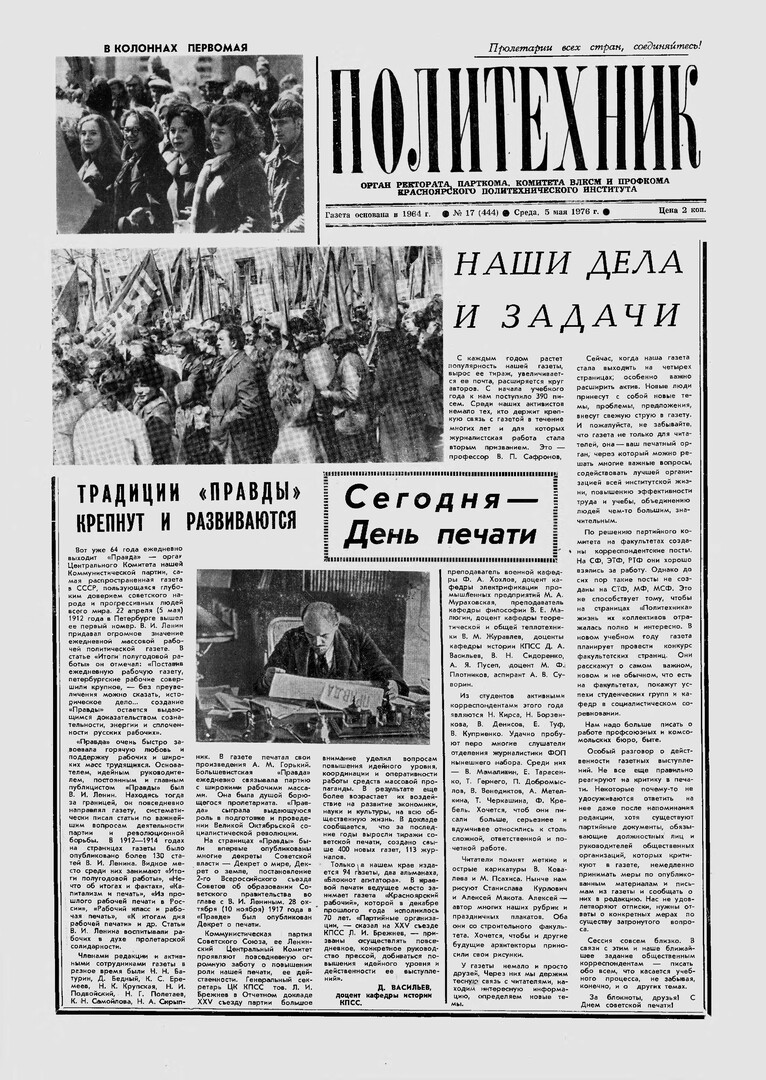 Политехник : газета/ Краснояр. политех. ин-т. - Красноярск : КГТУ, 1964 - - 2006 1976г. N 17 (444) (5 мая) http://lib3.sfu-kras.ru/ft/LIB2/ELIB_DC/SFUPRSV/sfupol/1976/1976_05_05_0444.pdf