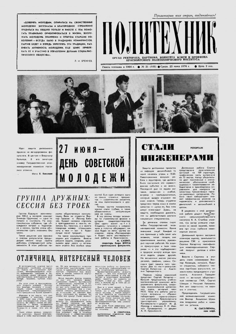 Политехник : газета/ Краснояр. политех. ин-т. - Красноярск : КГТУ, 1964 - - 2006 1976г. N 21 (448) (23 июня) http://lib3.sfu-kras.ru/ft/LIB2/ELIB_DC/SFUPRSV/sfupol/1976/1976_06_23_0448.pdf