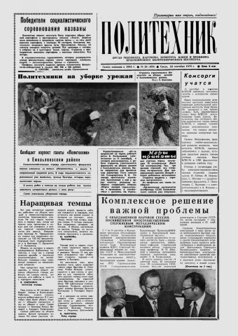 Политехник : газета/ Краснояр. политех. ин-т. - Красноярск : КГТУ, 1964 - - 2006 1976г. N 28 (455) (22 сентября) http://lib3.sfu-kras.ru/ft/LIB2/ELIB_DC/SFUPRSV/sfupol/1976/1976_09_22_0455.pdf