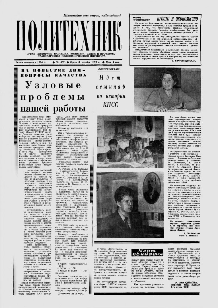 Политехник : газета/ Краснояр. политех. ин-т. - Красноярск : КГТУ, 1964 - - 2006 1976г. N 30 (457) (6 октября) http://lib3.sfu-kras.ru/ft/LIB2/ELIB_DC/SFUPRSV/sfupol/1976/1976_10_06_0457.pdf