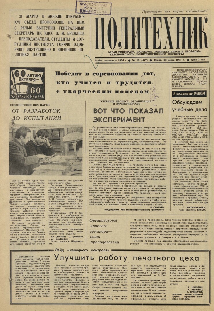 Политехник : газета. 1977 г. № 10 (477) (23 марта)