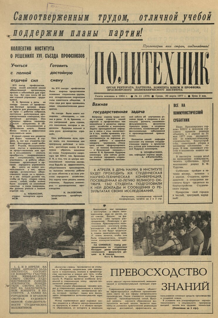 Политехник : газета. 1977 г. № 11 (478) (30 марта)