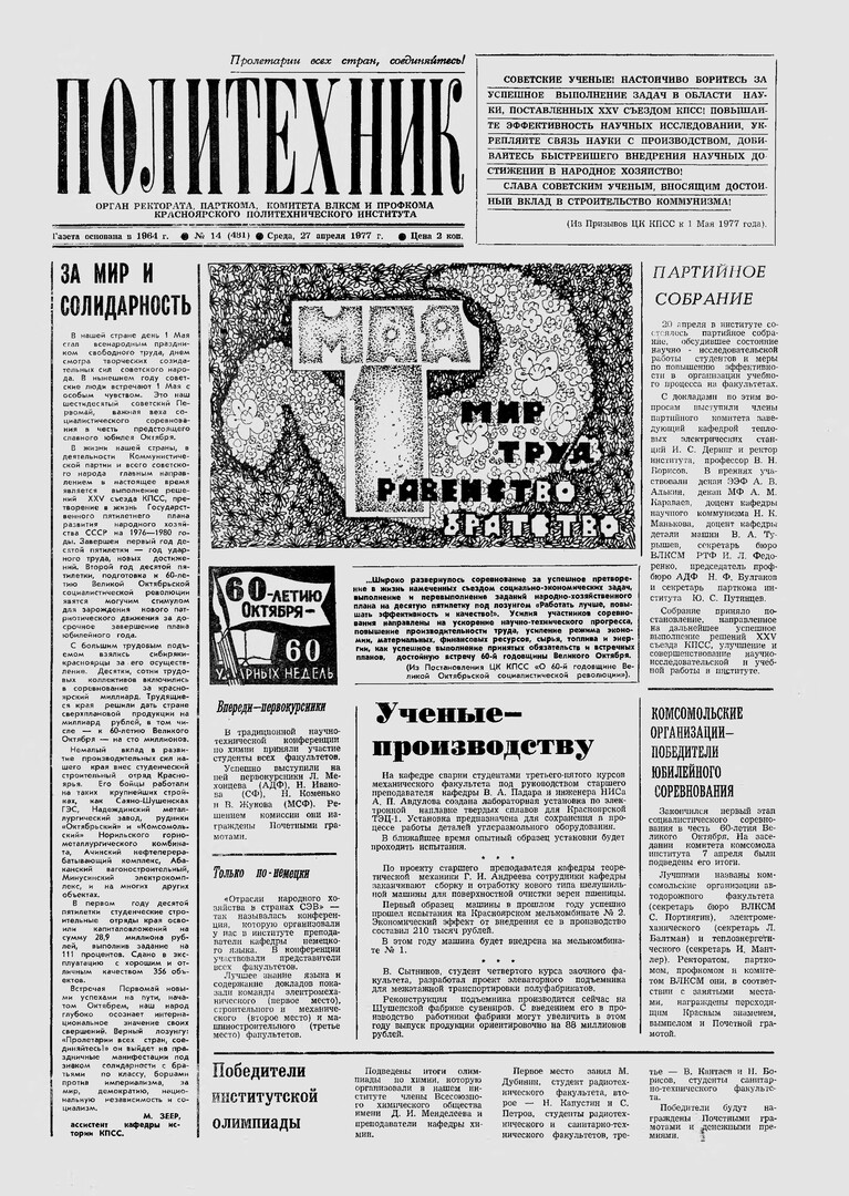 Политехник : газета/ Краснояр. политех. ин-т. - Красноярск : КГТУ, 1964 - - 2006 1977г. N 14 (481) (27 апреля) http://lib3.sfu-kras.ru/ft/LIB2/ELIB_DC/SFUPRSV/sfupol/1977/1977_04_27_0481.pdf