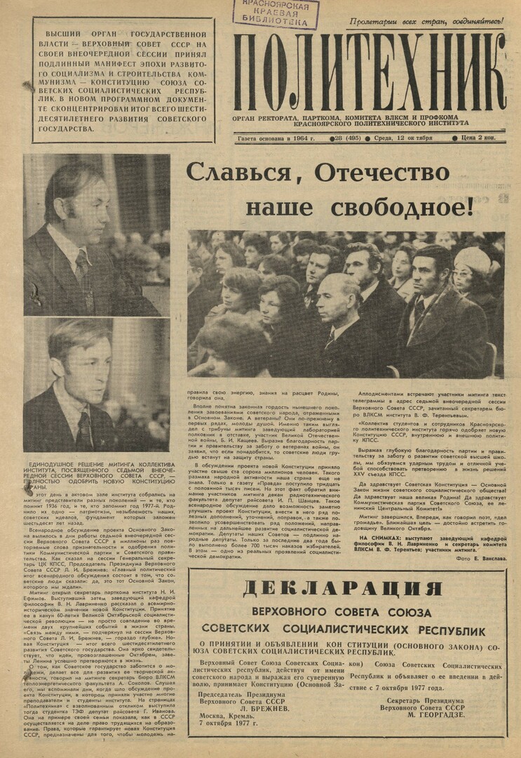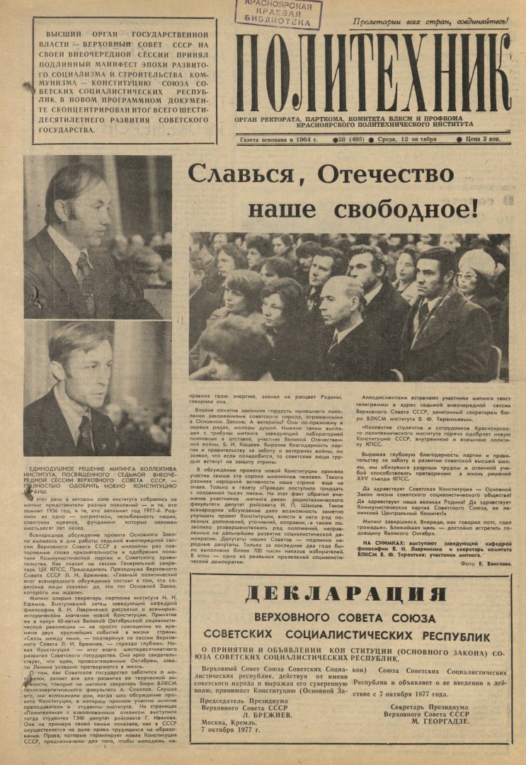 Библиографическое описание:Политехник : газета/ Краснояр. политех. ин-т. - Красноярск : КГТУ, 1964 - - 2006 1977г. N 28 (495) (12 октября)