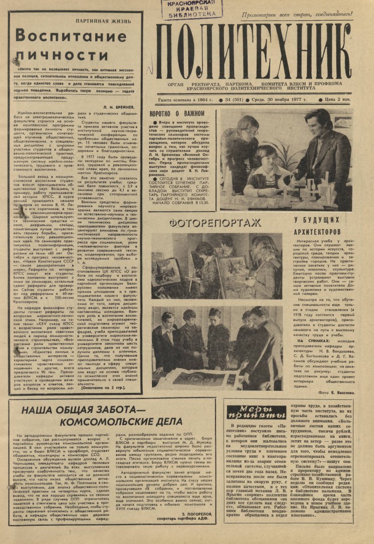Политехник : газета. 1977 г. № 34 (501) (30 ноября)