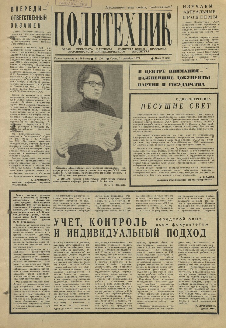 Политехник : газета. 1977 г. № 37 (504) (21 декабря)
