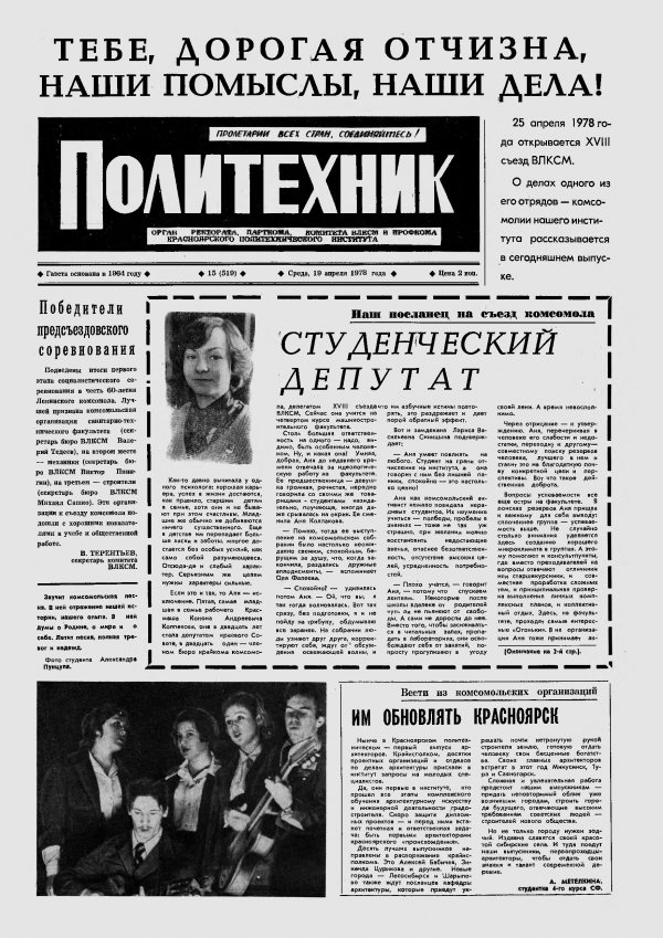 Политехник : газета/ Краснояр. политех. ин-т. - Красноярск : КГТУ, 1964 - - 2006 1978г. N 15 (519) (19 апреля) http://lib3.sfu-kras.ru/ft/LIB2/ELIB_DC/SFUPRSV/sfupol/1978/1978_04_19_0519.pdf