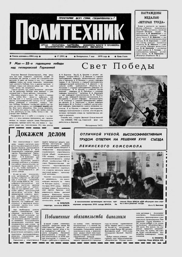 Политехник : газета/ Краснояр. политех. ин-т. - Красноярск : КГТУ, 1964 - - 2006 1978г. N 17 (521) (7 мая) http://lib3.sfu-kras.ru/ft/LIB2/ELIB_DC/SFUPRSV/sfupol/1978/1978_05_07_0521.pdf