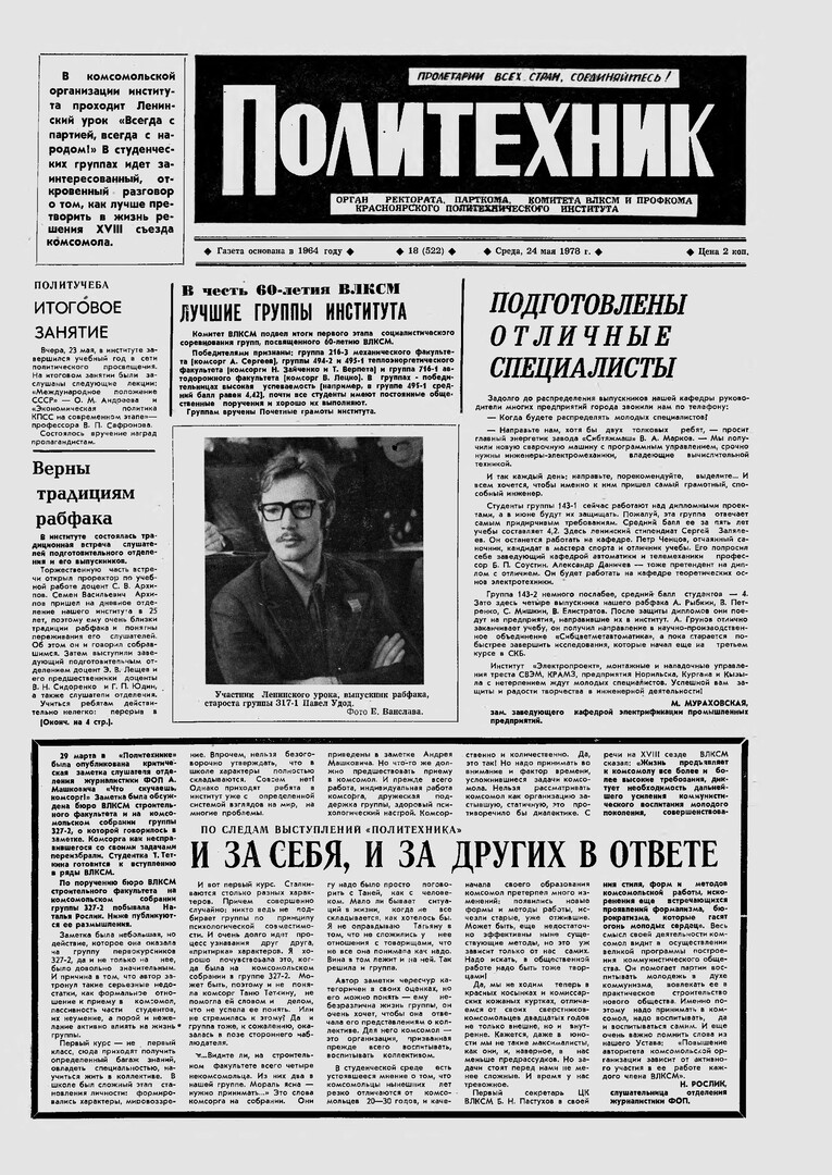 Политехник : газета/ Краснояр. политех. ин-т. - Красноярск : КГТУ, 1964 - - 2006 1978г. N 18 (522) (24 мая) http://lib3.sfu-kras.ru/ft/LIB2/ELIB_DC/SFUPRSV/sfupol/1978/1978_05_24_0522.pdf