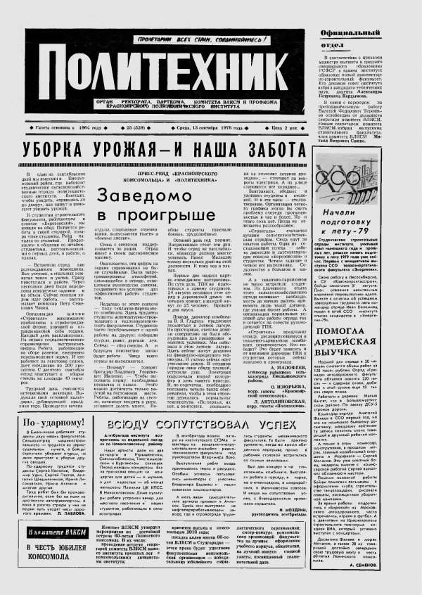 Политехник : газета/ Краснояр. политех. ин-т. - Красноярск : КГТУ, 1964 - - 2006 1978г. N 25 (529) (13 сентября) http://lib3.sfu-kras.ru/ft/LIB2/ELIB_DC/SFUPRSV/sfupol/1978/1978_09_13_0529.pdf