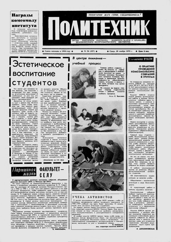 Политехник : газета/ Краснояр. политех. ин-т. - Красноярск : КГТУ, 1964 - - 2006 1978г. N 34 (537) (29 ноября) http://lib3.sfu-kras.ru/ft/LIB2/ELIB_DC/SFUPRSV/sfupol/1978/1978_11_29_0537.pdf