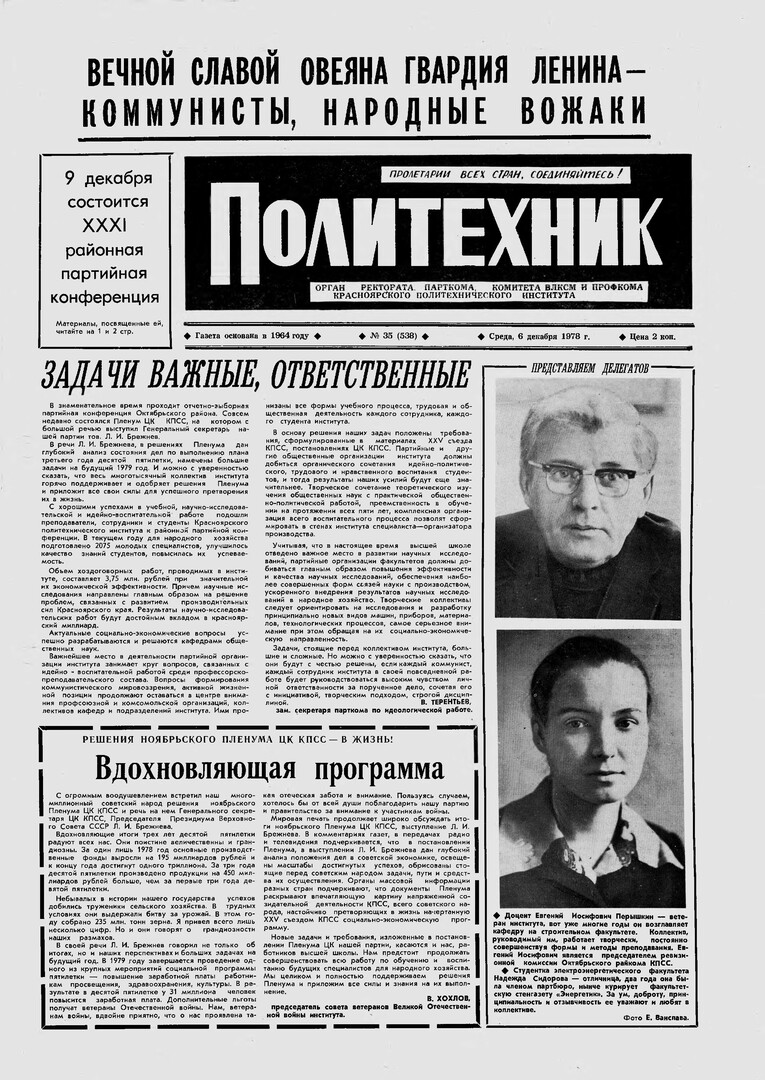 Политехник : газета/ Краснояр. политех. ин-т. - Красноярск : КГТУ, 1964 - - 2006 1978г. N 35 (538) (6 декабря) http://lib3.sfu-kras.ru/ft/LIB2/ELIB_DC/SFUPRSV/sfupol/1978/1978_12_06_0538.pdf