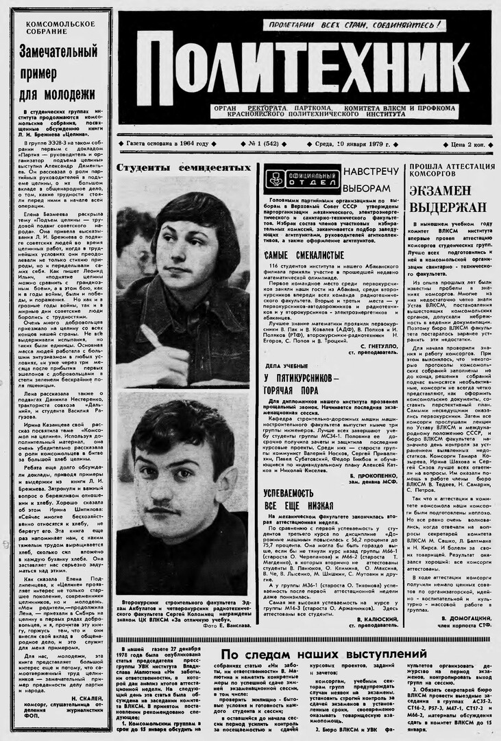 Политехник : газета/ Краснояр. политех. ин-т. - Красноярск : КГТУ, 1964 - - 2006 1979г. N 1 (542) (10 января) http://lib3.sfu-kras.ru/ft/LIB2/ELIB_DC/SFUPRSV/sfupol/1979/1979_01_10_0542.pdf