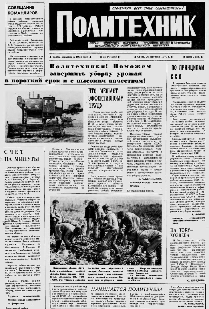 Политехник : газета/ Краснояр. политех. ин-т. - Красноярск : КГТУ, 1964 - - 2006 1979г. N 14 (555) (26 сентября) http://lib3.sfu-kras.ru/ft/LIB2/ELIB_DC/SFUPRSV/sfupol/1979/1979_09_26_0555.pdf