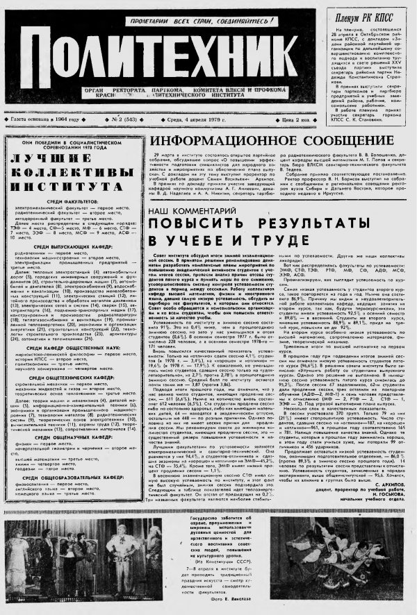 Политехник : газета/ Краснояр. политех. ин-т. - Красноярск : КГТУ, 1964 - - 2006 1979г. N 2 (543) (4 апреля) http://lib3.sfu-kras.ru/ft/LIB2/ELIB_DC/SFUPRSV/sfupol/1979/1979_04_04_0543.pdf