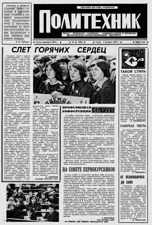 Политехник : газета/ Краснояр. политех. ин-т. - Красноярск : КГТУ, 1964 - - 2006 1979г. N 22 (563) (5 декабря) http://lib3.sfu-kras.ru/ft/LIB2/ELIB_DC/SFUPRSV/sfupol/1979/1979_12_05_0563.pdf
