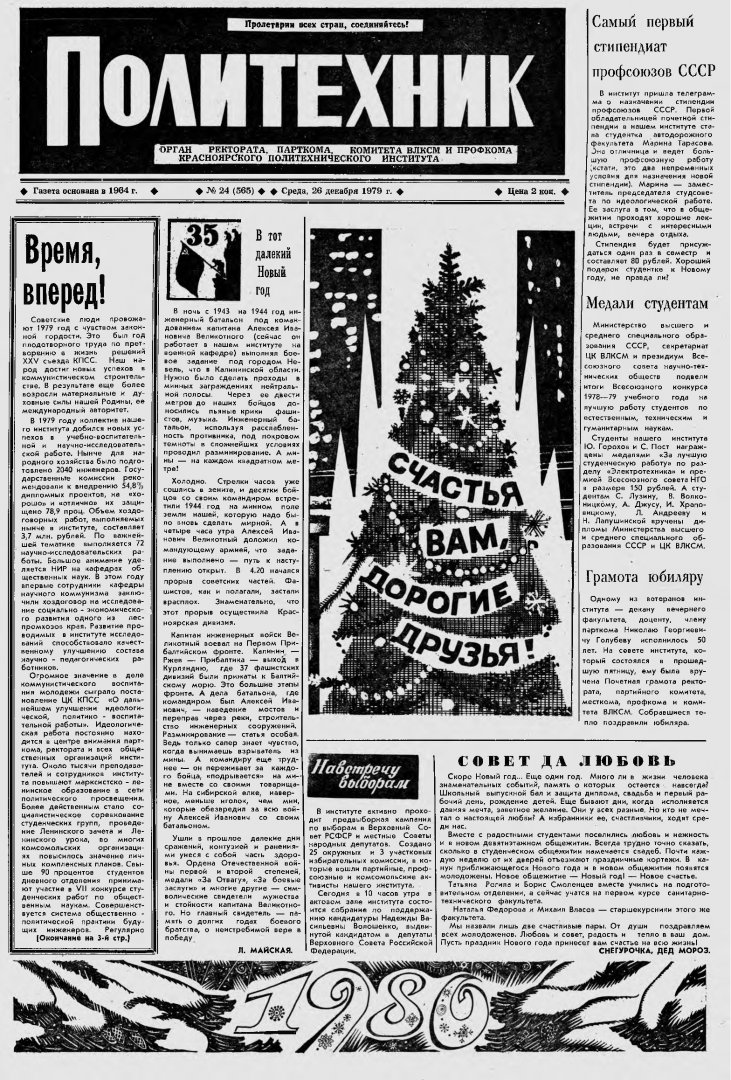 Политехник : газета/ Краснояр. политех. ин-т. - Красноярск : КГТУ, 1964 - - 2006 1979г. N 24 (565) (26 декабря) http://lib3.sfu-kras.ru/ft/LIB2/ELIB_DC/SFUPRSV/sfupol/1979/1979_12_26_0565.pdf