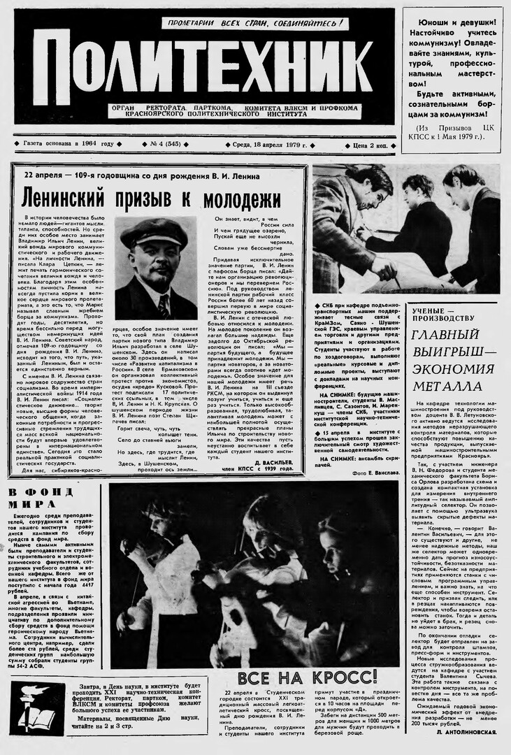 Политехник : газета/ Краснояр. политех. ин-т. - Красноярск : КГТУ, 1964 - - 2006 1979г. N 4 (545) (18 апреля) http://lib3.sfu-kras.ru/ft/LIB2/ELIB_DC/SFUPRSV/sfupol/1979/1979_04_18_0545.pdf