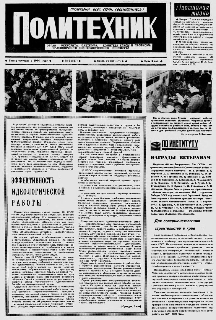 Политехник : газета/ Краснояр. политех. ин-т. - Красноярск : КГТУ, 1964 - - 2006 1979г. N 6 (547) (16 мая) http://lib3.sfu-kras.ru/ft/LIB2/ELIB_DC/SFUPRSV/sfupol/1979/1979_05_16_0547.pdf